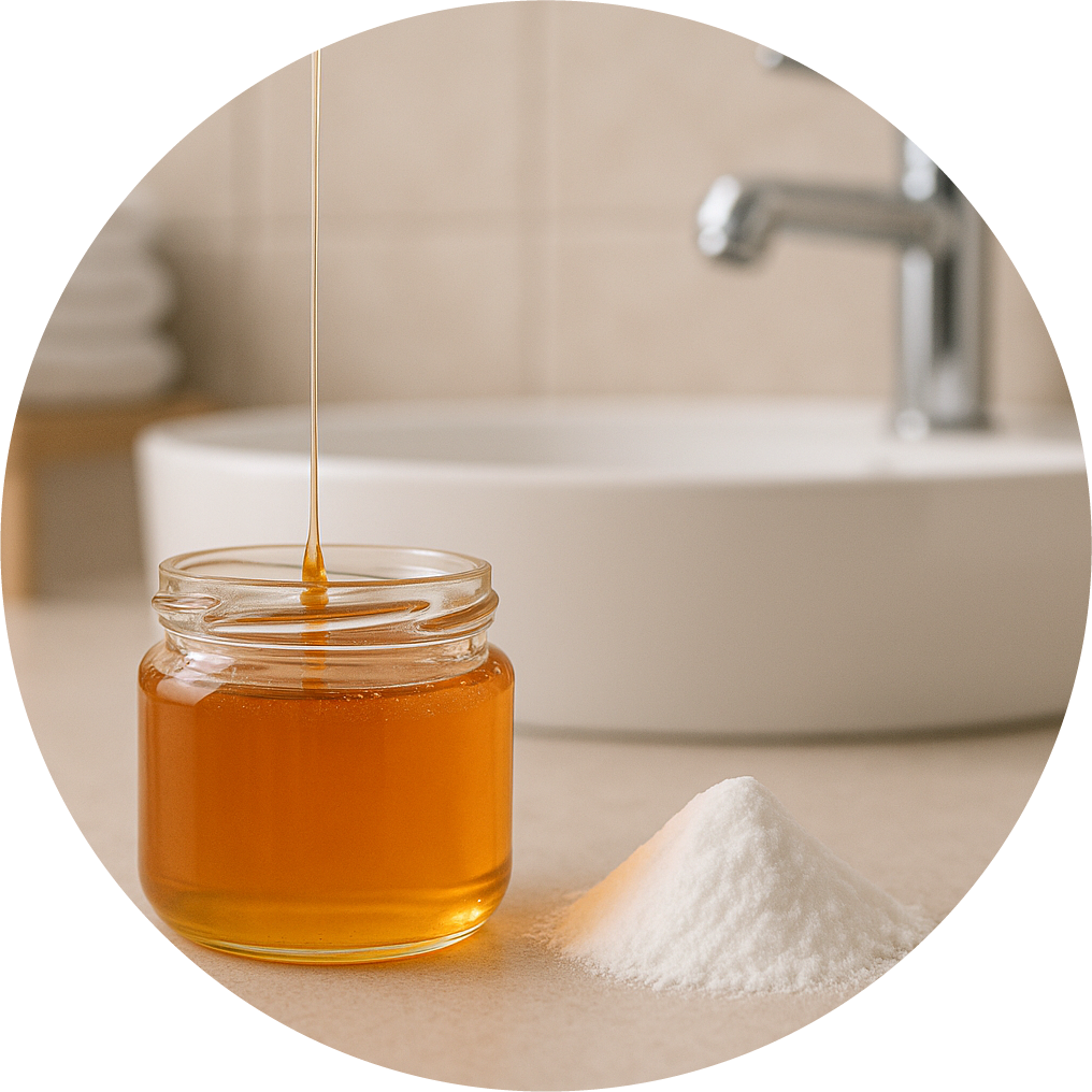 L’association bicarbonate-miel offre un double pouvoir purifiant, idéal pour les peaux grasses. Alors que le premier contribue à rééquilibrer le pH et le sébum (grâce à son action alcaline), le second resserre la peau, grâce à ses actions régénérantes et aux bienfaits du miel sur la peau.